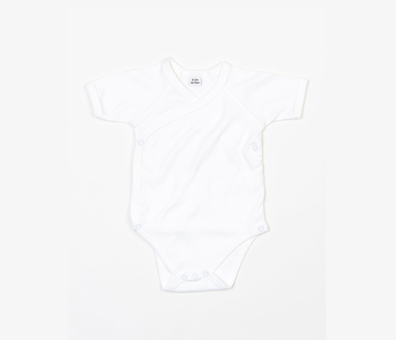 Cache-Cœur-Ausschnitt. Verschluss mit nickelfreien Druckknöpfen an der Seite und im Schritt. Schrägband am Hals, an den Ärmeln und im Schritt.
