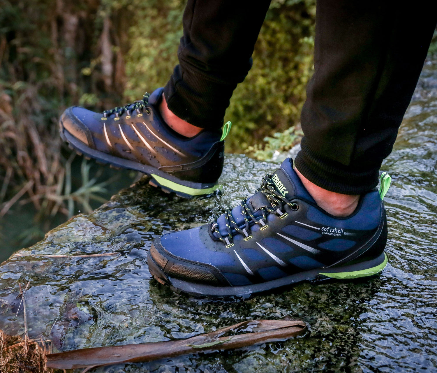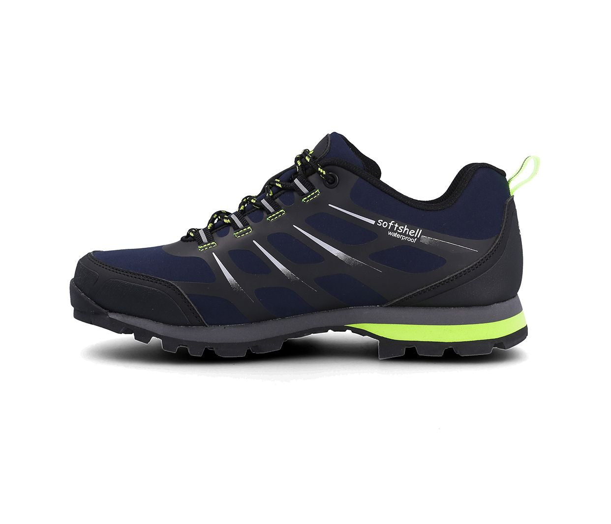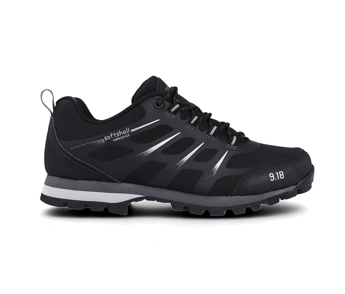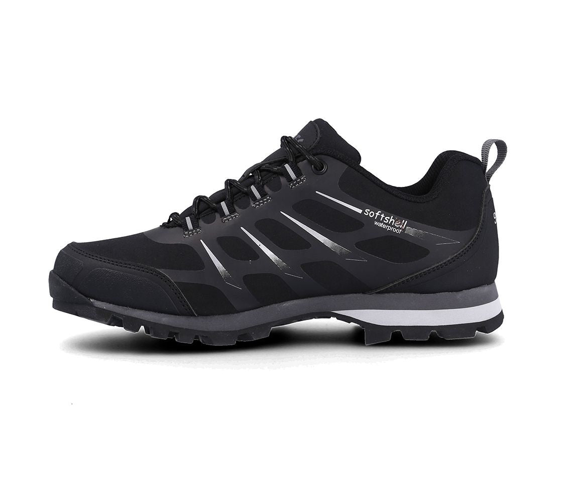 Außensohle aus Polyurethan und Gummi mit doppelter Dichte. Obermaterial aus Softshell mit Verstärkungen im Zehen- und Fersenbereich. Wasserdichtes Futter.