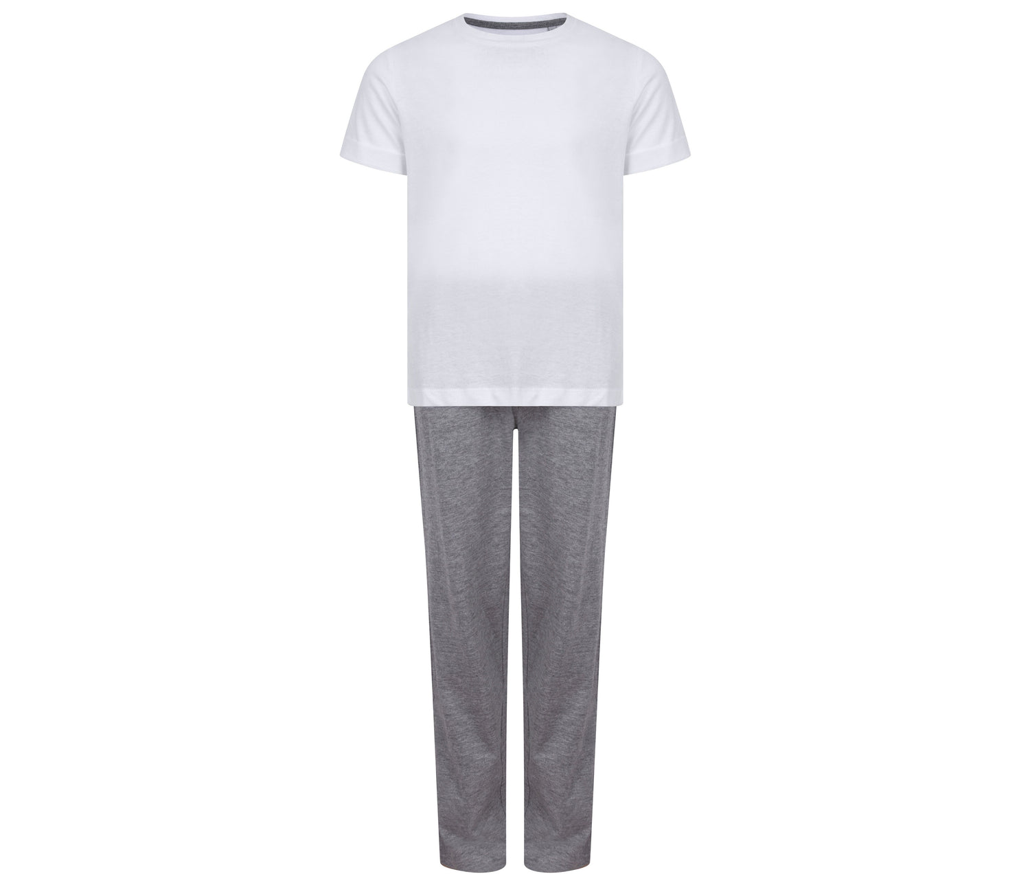 Set : weißes T-Shirt und kontrastierte Hose. Doppelnähte am Bund des T-Shirts. Elastischer Hosenbund mit Zugband.