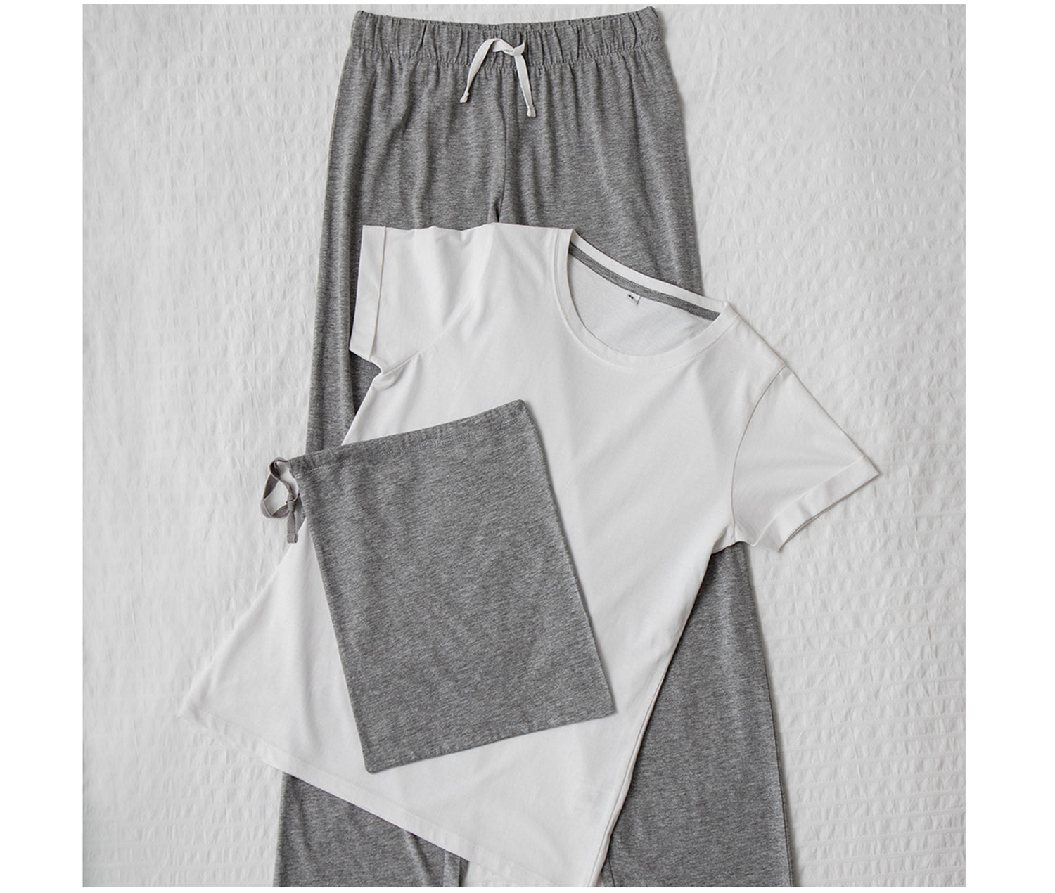 Set : weißes T-Shirt und kontrastierte Hose. Sanft und leicht. In einer kontrastierten Tasche mit Zugband verkauft.
