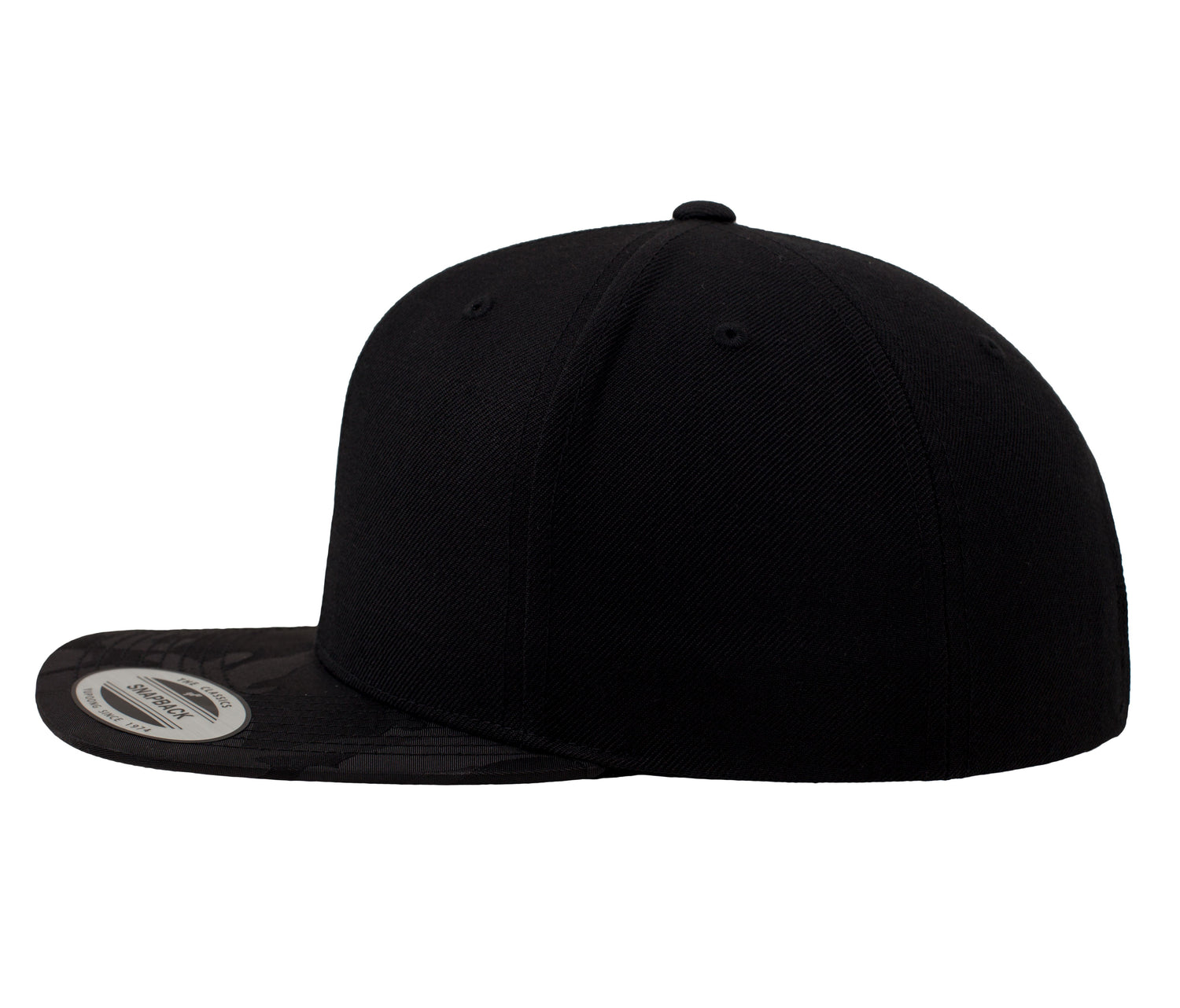 Contrasting upper and lower visors. 6 panels. Flat visor. Tab closure.