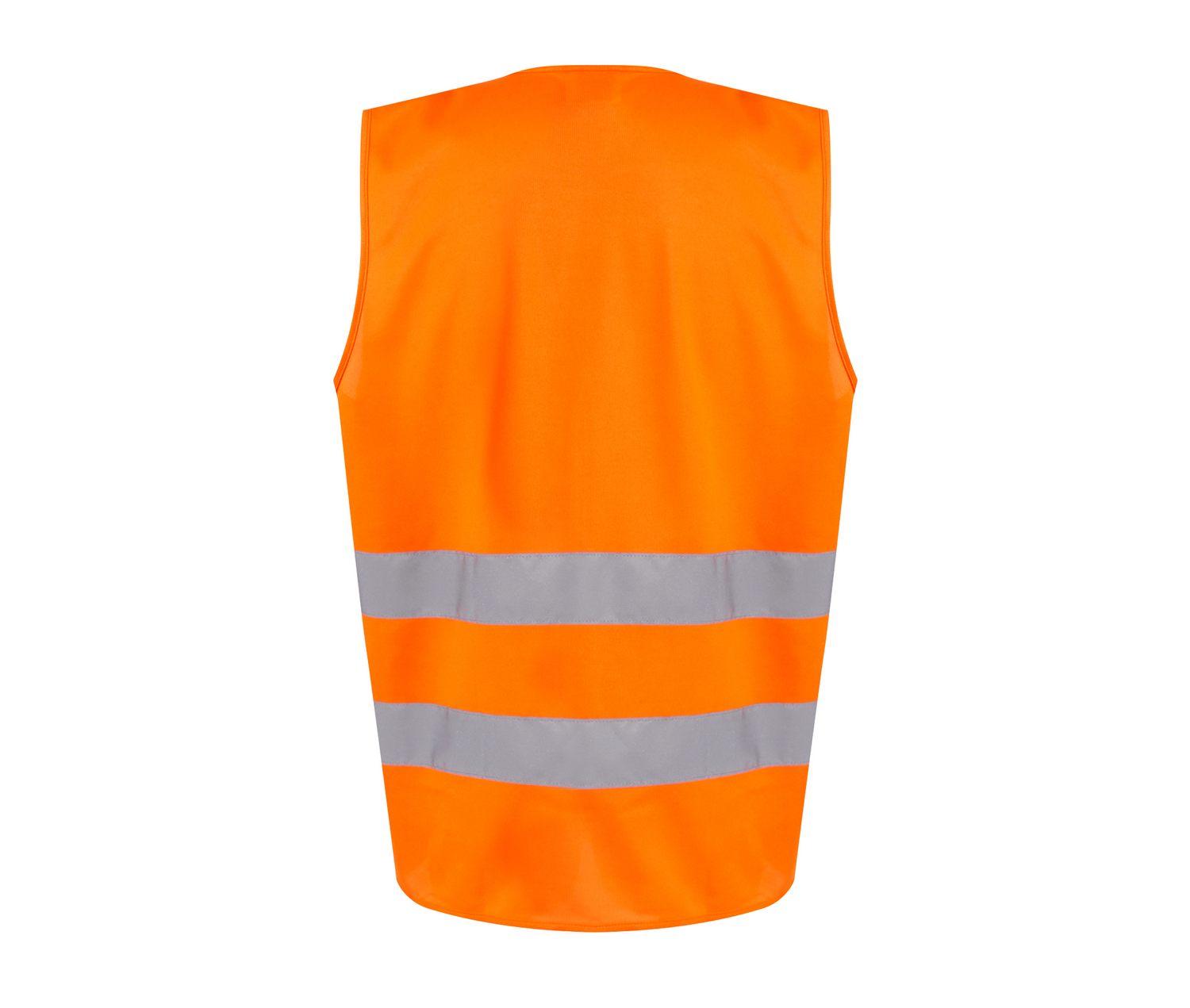 Certified according to EN ISO 20471:2013 A1:2016 Class 2. The orange color also complies with the RIS-3279/TOM standard. Velcro® closure. Two horizontal reflective stripes (stitched).